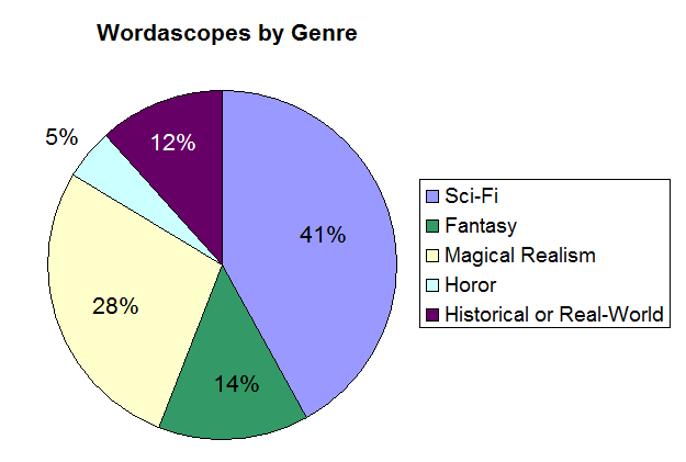 After crunching through the raw numbers, I assigned each of the wordascopes an approximate genre. Sci-fi, fantasy and horror are all fairly self-explanatory. Magical realism is slightly nebulous umbrella heading I gave to any of the stories which could be described as “weird stuff happening in normal places.” Historical or real-world is the catch-all title I used for anything that could broadly be considered as normal things happening in normal places, past or present.