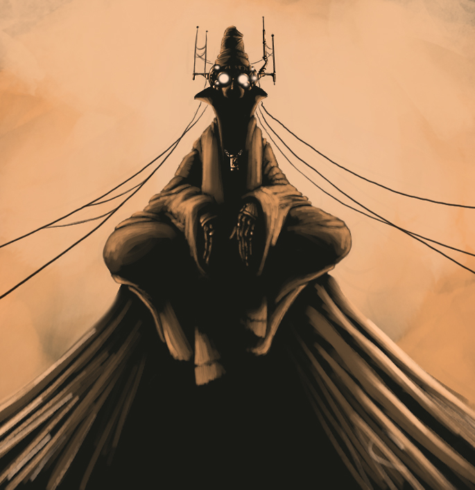 The unworld which houses the Relay is swaddled in clouds of pale and pallid beiges and drab, dead magnolias. At the centre of this stillness within the maelstrom there is a lone figure; neither sitting nor standing, but floating hunched and on haunches as if hung from the sky. The figure’s robes rustle and sway in the eddies of the temporal winds, a web of wires lead from the impenetrable clouds at the hinterlands of the nexus and into the skull of the Relay, tangling themselves around a crown of aerials and antennas. The All-Seer sees with sight beyond sight, through clusters of eyes wrought from glass, copper, whole constellations of rare earth metals and of mater most strange. Its eyes gaze down funnels of spacetime into the everything and the everywhere. It sees what once was, what is and sometimes what may be. It is a piercing gaze to which no barrier, nor firmament, nor occlusion is proof. In this little pocket outside of the world the Relay sees what has been forgotten and what has been lost. It records, it uncovers, it observers, and it sends that which it finds on to “interested parties.”