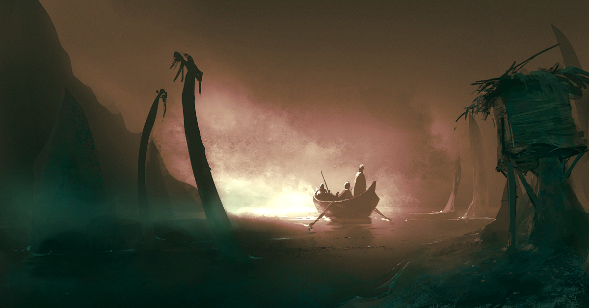 The oars sliced into the thick, murky waters, each stroke stirring the stagnant depths and caking the blades with a foul-smelling, black silt. The sun had long since begun to dip below the horizon, its coming departure drawing out swarms of small, black flies. Their fluid, undulating mass filled the air with a low drone that spoke as echoes of a cruel and primal mire that had not yet had the decency to die or be tamed. The flies feasted and gorged their small forms on the exposed skin of the ferryman and her passenger. Their proboscises piercing and puncturing the skin like a thousand minute knives, leaving fat, itching welts; a faint reminder that this was not a place for people. This was the third of the nine swamps of Trolah; The Weeping Fever; the jewel in the fetid crown. The only swamp which fed into the Nightmare Mangroves of the Thrice Killed King. The King whose strange and fell arts had conspired down the centuries, even in the wake of his third and final death. Though he might be at last expelled into the cold oblivion of death, the whiles and mischiefs of the priests who knelt at his altar still blighted the world. Like their master, their influence and malice reaching back from even beyond the veil of death.
