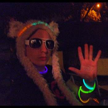 I woke up sharply at the third clap, at least I think it was the third clap, sitting next to me was a strange-looking bloke. He was wearing sunglasses, in the middle of the night. Even in my drunken state that struck me as being, as the kids of today would put it “Well weird.” Hung about his arms and neck were an entire rainbow of glowstick bracelets. The final capstone to this madman’s attire was his hat. It was pink, fluffy and had bear ears. The noises that had been haunting me. As I looked at him he stopped and raised his hand in greeting to me.